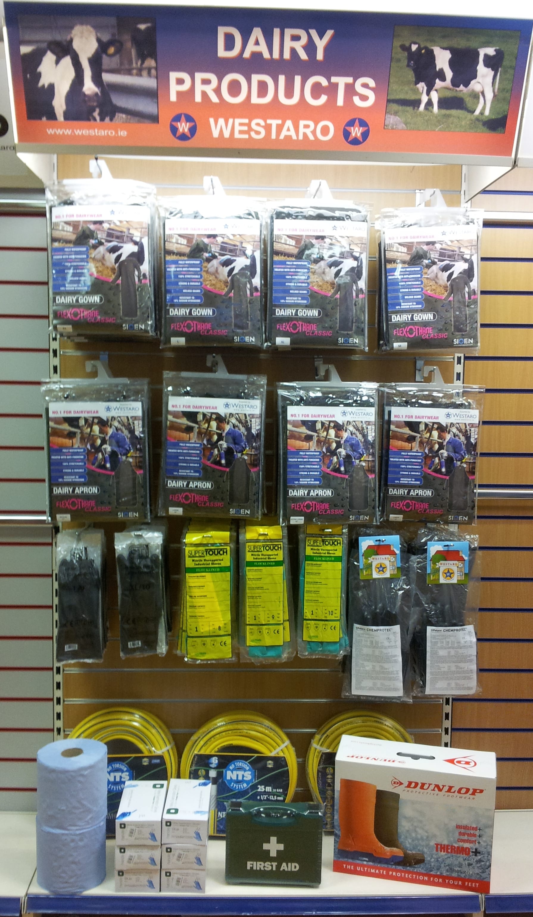 The Dairy Product Range Planogram has a variety of items such as Dairy Gowns, Dairy Aprons, Heavyweight Latex Black Gloves, Green Nitrile Gloves, Disposable Blue Nitrile Gloves, Dairy Paper, Flexothane Dairy Leggings, Flexothane Bib & Brace, Black Rubber Milking Gloves, White Plus Hosing, First Aid Kits (1-10 People) and Thermo Wellingtons.